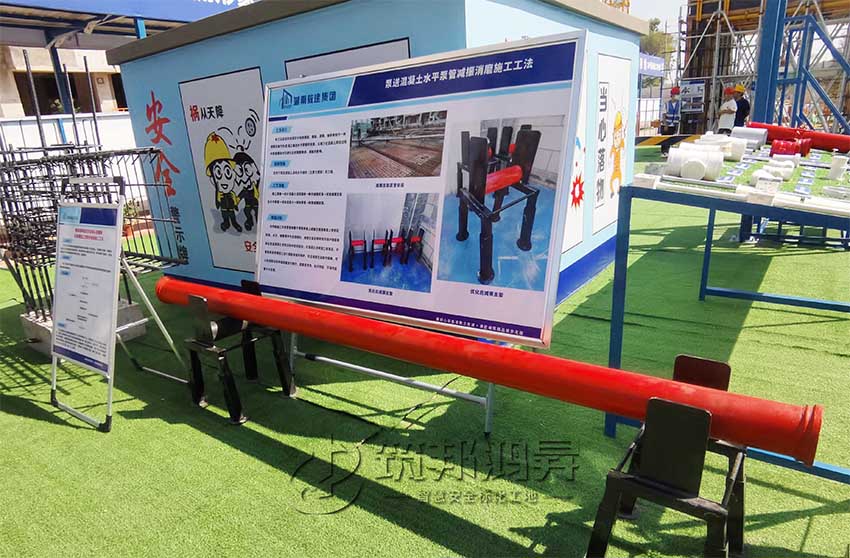 在觀摩會現(xiàn)場,還有一個紅色圓柱外形的東西吸引了眾多觀摩人員的注意。湖南教建集團(tuán)有限公司國欣向榮廣場項目項目總指揮長李海平介紹,這是其公司自創(chuàng)的泵送混凝土水平泵管減振消磨施工工法。該工法運用的關(guān)鍵在于利用鋼筋、鋼板、滾筒、軸承等制作一種減振支架作為混凝土輸送水平泵管的支座,以減少在混凝土泵送過程中泵管振動對已綁扎好的鋼筋骨架、模板的影響。